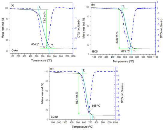 Notably, for all three samples, the initial stage of gradual weight loss due to moisture removal up to 100 °C and adsorbed gases up to 250 °C is practically unnoticeable. This is typically the case with coal or biomass/biochar; however, since coke or biocoke is a more heat-treated carbon material, this stage is not noticeable from the curves, considering low moisture and volatile matters, although it is evident from the proximate analysis in Table 2.