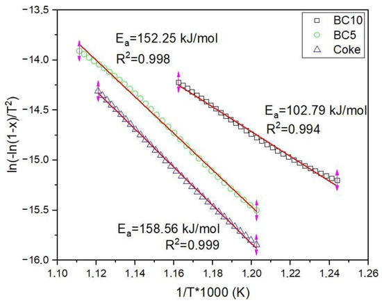 Although the activation energy values for coke and biocoke with 5 wt.% wood pellets were close to the values specified in [18] for a heating rate of 5 °C/min calculated by the Coats–Redfern method, they were marginally lower. This difference can be attributed to the fact that the samples in this study were laboratory-based. Adding 10 wt.% wood pellets to produce biocoke significantly contributed to decreased activation energy.