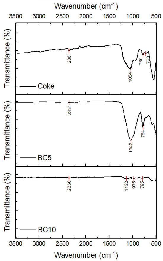The presence of oxygen-containing groups [33] is specific to coke, which is indicated by a C–O stretching peak (related to primary alcohol) at 1054 cm−1 and 1042 cm−1 for biocoke with 5 wt.% wood pellets. Meanwhile, biocoke with 10 wt.% wood pellets features a peak at 1132 cm−1, signifying aliphatic ether functionality. Transmittance peaks at 900–700 cm−1 refer to the C–H bending vibrations of aromatic hydrocarbons, which sharply decrease for biocoke with 10 wt.% wood pellets, indicating the elimination of functional groups of aromatic compounds, resulting in a change in their relative –CH content. For biocoke with 10 wt.% wood pellets, the intensity of the peaks is very weak compared to coke or biocoke with 5 wt.% wood pellets, indicating that biocoke with 10 wt.% wood pellets has almost entirely reacted with air oxygen.