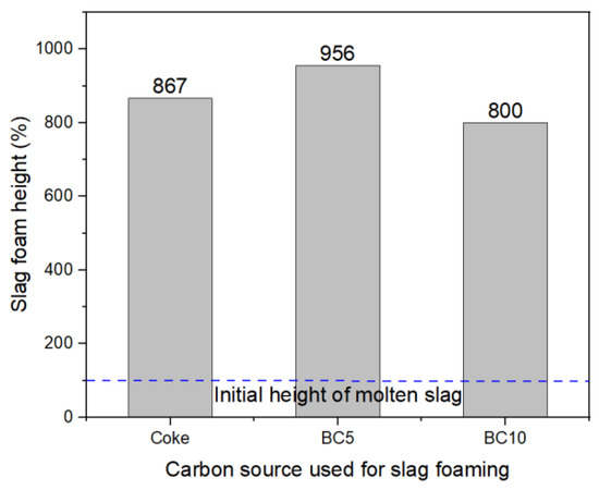 Figure 5 depicts the variations in slag height subsequent to the addition of a carbon source. It shows significant changes in height compared to the initial height of the molten slag. The highest height was observed when utilizing biocoke with 5 wt.% wood pellets, reaching 8.6 cm. In contrast, using coke resulted in a foaming height of 7.8 cm, with a foaming time of approximately 580 s. The use of biocoke notably reduced the foaming time, particularly evident when employing biocoke with 10 wt.% wood pellets. This variant of biocoke exhibited the smallest foaming height, likely due to insufficient reaction time, leading to a decrease in the observed height.