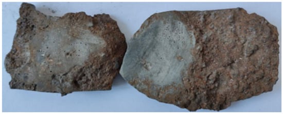 The slag crust adhered to the hot surface of a copper stave has a very low thermal conductivity, which can provide good protection for copper staves in high-temperature areas. The thermal conductivity and reflowing temperature of the slag crust are the most important parameters for calculating the thickness of the slag adhesion layer. Currently, the thermal conductivity of the slag crust is generally believed to be the range of 1–5 W (m K)−1 [17,24]. It is mainly influenced by the slag crust’s chemical composition or phase composition. There are significant differences in the composition of slag crust based on different raw material conditions. Samples were taken from the hot surface of the copper cooler in the high-temperature zone of a blast furnace, taking advantage of the opportunity of maintenance of the blast furnace stockline. In order to accurately predict the thickness of the slag crust on the copper stave of the blast furnace, the chemical composition of the slag crust was analyzed, and physical–chemical properties such as thermal conductivity and melting performance were also tested. Figure 1 shows the adhesion state of slag on the surface of the copper stave in the high-temperature zone of the lower shaft of the blast furnace. Figure 2 shows the morphology of the slag crust.
