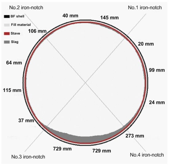 The aforementioned phenomenon can be explained by the fact that a thicker slag crust results in a lower effective volume of smelting in the lower part of the blast furnace. This is detrimental to the smooth flow of furnace material and reduces the number of blast furnace material batches, blast volume, and output rate. In addition, anomalous furnace conditions are likely to arise, including irregular circumferential airflow, variations in the temperature field, and bonding in specific regions. As seen in Figure 6, limited blast volume causes insufficient airflow in the bosh section between the #3 and #4 iron notches (tapholes), which lowers the temperature and causes the bonding of a noticeably thicker slag crust in this area. These outcomes are detrimental to the development of indirect reduction in the blast furnace and lead to a lower gas utilization rate and higher coke ratio.