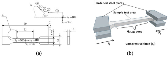 Figure 2a shows the dimensions and surface roughness of the uniaxial sample; the length was 60 mm, width 10 mm and thickness 3 mm. The transition between the gauge zone and the clamping areas was designed using “the method of tensile triangles” after Mattheck [56], which aims at minimizing the stress concentration factor Kt in these areas. For this purpose, a spline with 5 points was defined, as described in Table 1 and shown in the detailed view A of Figure 2a. The tangent of the spline curve had an angle of 45° at point 5 with respect to the x1-axis. At point 1, the tangent was parallel to the x1-axis. Within this work, the x1-axis is used throughout as the RD, the x2-axis as the transverse direction (TD) and the x3-axis as the normal direction (ND). Figure 2b is a CAD drawing showing the sample and hardened steel clamping plates of the in situ tester and indicating the direction of the applied load (F1) parallel to x1.