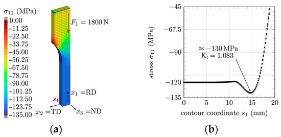 Figure 3 shows the results of a finite element method (FEM) simulation that was used to support the optimisation of the sample geometry [55]. A linear elastic material model with a Young’s modulus of E = 42,866.5 MPa and a Poisson’s ratio of 0.32 was used. Due to the three-axis symmetry of the sample, only one eighth of the sample was modeled. Hexahedral isoparametric elements with quadratic shape functions were used for the discretisation and approximation. A compressive force F1 = −1800 N was applied as a homogeneously distributed force in the clamping area. Figure 3a shows the color plot of the normal stress σ11(x1, x2, x3) from the FEM simulation. Within the gauge area, the normal stress σ11 represents the maximal principal compression stress σ3, and therefore x1 is the corresponding principal direction of σ3. The simulation proves that a homogenous and uniaxial stress is achieved in the gauge area. Furthermore, the plot of the normal stress σ11 along the contour coordinate s1 from Figure 3b shows that a small stress concentration factor of Kt = 1.083 is achieved using “the method of tensile triangles”. This design ensures that plastification starts in the gauge zone. The surface roughness of the milled edges was nominally Ra = 0.6 µm, fine enough to prevent roughness-induced strain nucleation.