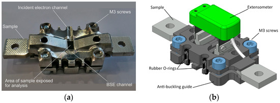 Figure 4 shows the ABG made to prevent the buckling of the sample during compression. The ABG was constructed from low-magnetic chrome/nickel steel (AISI 303) to prevent the magnetic disturbance of the electron beam. The cutaway channels in the ABG allowed space for the incident electron beam to reach the sample and for the cone of backscattered diffracted electrons to reach the detector. Four M3 steel screws were used to fix the ABG, four rubber O-rings were used to secure the extensometer in place and a 0.3 mm thick PTFE sheet placed between the ABG and the sample prevented contact friction during compression.