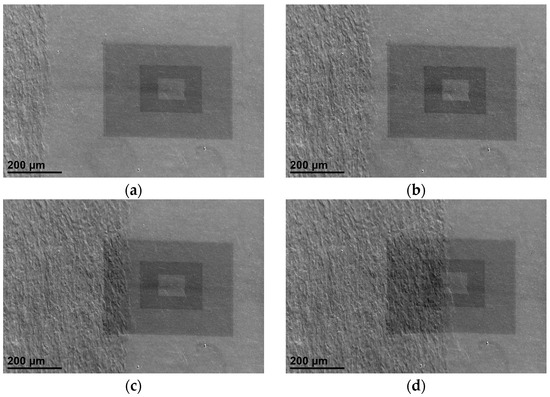 Figure 6 shows SEM images of a BTG that has grown from left to right (in the x1 direction) in the image with increasing compressive extensometer strain. The rectangular areas are due to hydrocarbon contamination in the SEM chamber being electrostatically attracted to the electron beam and deposited on the sample surface [59]; the analysed and mapped area was the centremost of these. Once an area was chosen for study, a reference mapping was made at zero load. The DC motor was driven and stopped as soon as a BTG appeared in view so that the BTG could be studied as it grew. The BTG grew from left to right in the images, and in Figure 6d had entered the analysed area. As the extensometer strain increased, other areas of the gauge zone underwent deformation so that the progress of the BTG in view was not necessarily linear with an increasing load. When a BTG had entered the analytical area, the motor was paused and an EBSD map made, which could be directly compared with the reference map to reveal the changes in the microstructure.