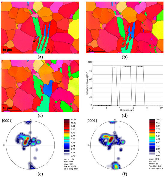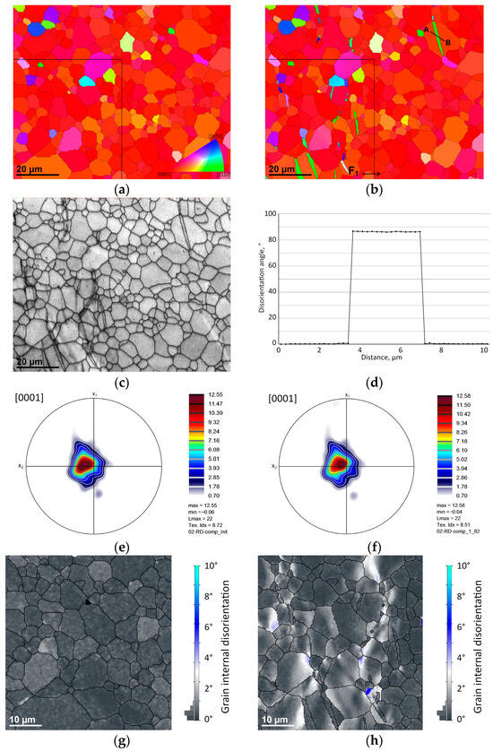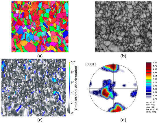 Figure 7c shows the band contrast (BC) for the same area at slightly higher magnification. The image shows no indication of preparation-induced damage such as scratches even though the band contrast is very sensitive to lattice distortion. Figure 7d shows an orientation line scan across the twin in the upper-right corner (along the indicated line A to B). Analysis of the twins reveals a disorientation angle with respect to the parent grains of approx. 86.3°, which is consistent with extension-type twinning where the magnesium lattice has effectively become rotated so that the c-axis is no longer normal to the sheet but closer to being in-plane [62,63]. Individual twins are observed to form approximately normal to the maximal compression stress σ3, while macroscopic BTGs form more precisely normal to it (compare with Figure 3 and Figure 5).