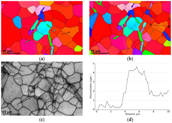 Figure 9 shows lattice orientation maps of the magnesium AZ31B sample at a −3.5% and −3.9% extensometer strain where twins can be observed forming and growing. Of particular interest is the grain marked with an arrow in Figure 9a. In the band contrast image of Figure 9c, this grain appears to be twinned, but the orientation map of Figure 9b shows only faint discoloration of the corresponding area, and the line scan along the line A–B across this grain in Figure 9d shows that the lattice is distorted by only up to 4°. This suggests that the twin is only just beginning to form and yet has a width of around 4 µm. This suggests that BC can be used to identify the early stages of twinning but does not reveal the actual rotational degree of twinning. Figure 9c shows other areas of lattice disruption that resemble the early stages of twinning and that do not appear in the orientation map. The growth of twins from one grain into another is also apparent in several locations.