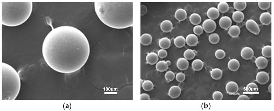 SEM images of the Zir Shot Y300 projectile used in the Shot peening treatment. (a) 120× magnification; (b) 30× magnification.