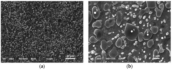Microstructure of Böhler K390 steel in the annealed state (as delivered) using secondary electron images (SEI). (a) A high density of carbides is observed (magnification of 3000×); (b) points with EDX semi-quantitative microanalysis are pointed out (magnification of 10,000×).