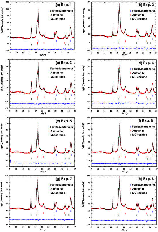 Table 6 shows the weight percentages and the lattice parameters of the crystal phases observed by X-ray diffraction. It must be taken into account that, in all experiments, ferrite (tempered martensite) is the majority phase, and that the VC was the only carbide observed. Besides, it must be mentioned the existence of retained austenite in all the experiments.