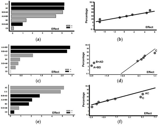 Graphic representation of the effects using Pareto charts and standard probability paper; (a,b) about austenite content; (c,d) about VC content; (e,f) about ferrite (tempered martensite) content. Factors with significant effects are specified.