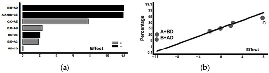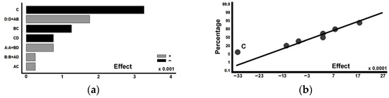 Graphic representation of effects on impact toughness using Charpy test; (a) Pareto chart; (b) standard probability paper. Factors and interactions with significant effects are distinguished.