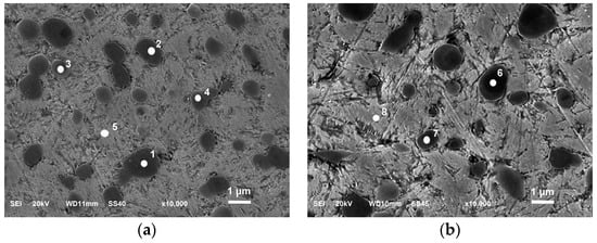 Microstructure after thermal processing using secondary electron images (SEI). (a) Experiment 5 (magnification of 10,000×); (b) Experiment 4 (magnification of 10,000×). Points submitted to semi-quantitative microanalysis by EDX have been pointed out.