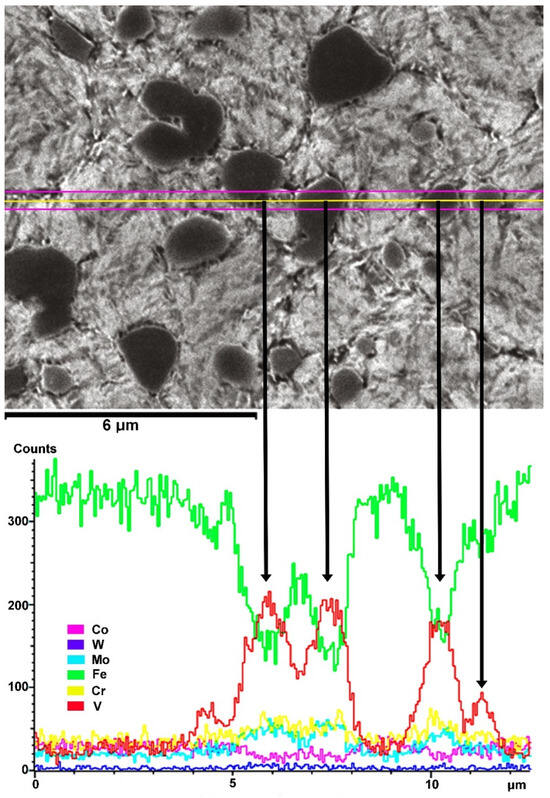 Figure 7 shows the relative concentration of each element along the scanning line. V is the most abundant alloying element. However, it can be observed that this element is mainly concentrated in the carbides, as opposed to its solid solution state. The same behavior seems to be repeated for Cr and Mo. W and Co, however, seem to tend to be found in solid solutions in the matrix constituent.