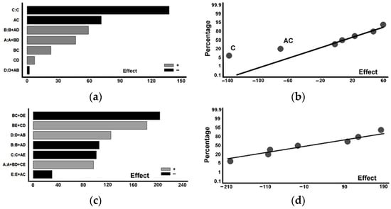 Graphic representation of effects on hardness by means of Pareto charts and standard probability paper; (a,b) effects on hardness of the material with no surface treatment; (c,d) effects on material hardness after surface treatment.