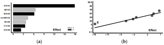 Graphic representation of effects on mass loss due to abrasive wear; (a) Pareto chart; (b) standard probability paper. The significant effect of the E factor (surface treatment) is distinguished.