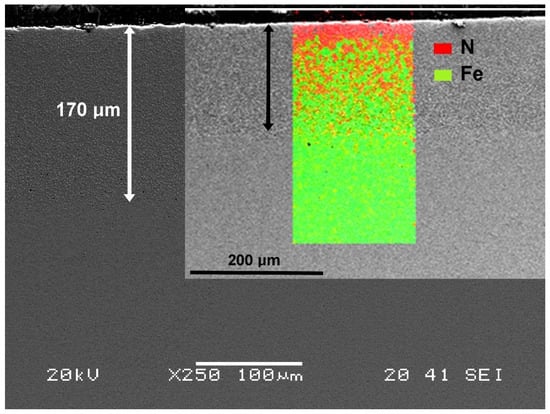 - The nitrided layer thickness is between 150 and 175 μm, and the N content gradually decreases from the surface towards the inner part. Carbides are affected by nitriding and, at an intermediate depth of the nitrided layers, they have about 10% atomic values in N variables. These values are higher in the matrix constituent, even above the 20% atomic value in N.
