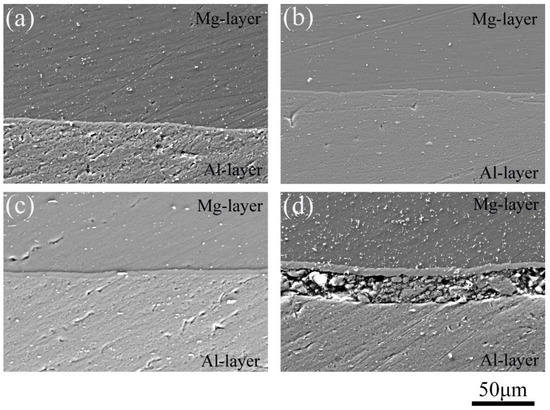 SEM images capturing Mg/Al sheets fabricated through hot pressing under varying strain rates: (a) 1.0 × 10−2 s−1, (b) 2.0 × 10−3 s−1, (c) 1.0 × 10−3 s−1, (d) 3.3 × 10−4 s−1.