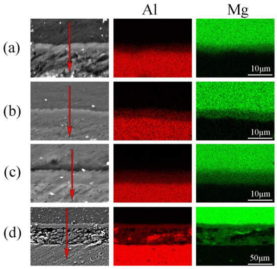 Moreover, previous studies have shown that both high temperatures and prolonged holding times can lead to the formation of Kirkendall holes on the Al side [32]. It is reported that when the annealing temperatures exceed 250 °C, conspicuous Kirkendal voids can be seen at the interface [10]. The emergence of these voids is expected to diminish the overall properties and bonding strength. The primary factor underlying this phenomenon is the discrepancy in diffusion rates between Mg and Al at the interface. Generally, Al exhibits a swifter inter-diffusion rate compared to Mg [36]. Consequently, the surplus vacancies on the Al side eventually facilitate the generation of voids. In this study, no voids appeared at the interface. This may be related to the pressure applied by the hot-pressing process. Hot-pressing deformation can promote inter-diffusion and cause plastic flow of the material, which, in turn, eliminates the voids.