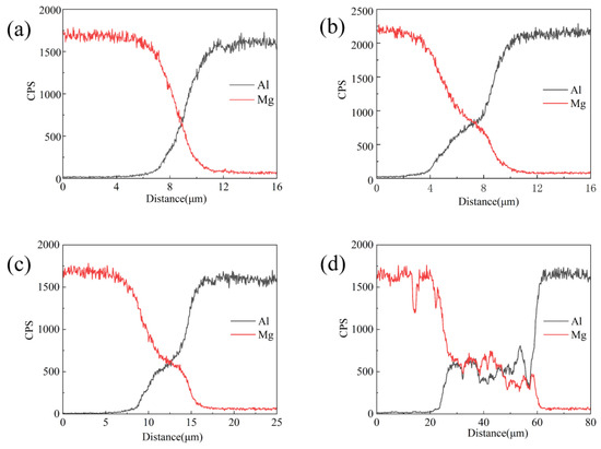In order to delve deeper into the interface characteristics, Figure 2 presents magnified SEM images along with area-scanning images. It is evident that a distinct interface layer is visibly formed between AZ31 and 1060 during the hot-pressing process. The element Mg and element Al exhibit full inter-diffusion across the entire interface. This further proves that direct hot pressing in an atmospheric environment can generate an effective bond at the interface of AZ31 and 1060. As the strain rate decreases, the thickness of the inter-diffusion layer gradually increases. Figure 2d shows that the interface layer of the P4 sample is obviously broken. This is primarily the underlying cause for the presence of numerous cracks and pores on the interface of the P4 sample. As the strain rate decreases, a noticeable trend emerges: the diffusion layer progressively thickens. The element line-scanning spectrums of different samples are shown in Figure 3. Due to the occurrence of inter-diffusion, the concentrations of Mg and Al show a gradual change at the interface. Within this diffusion layer, the concentration of Al decreased from the Al alloy side to the Mg alloy side, while the concentration distribution of Mg exhibited the opposite trend. SEM studies revealed no evidence of intermetallics in the bonding structure. Moreover, no significant single-phase layer is found at the interface for the P1, P2, and P3 samples. For the P4 sample, significant fluctuations in the concentrations of the elements at the interface occur, which are related to the fragmentation of the compounds. Through the analysis of these spectrums, the thickness of the diffusion layer is determined and presented in Figure 4. Specifically, when the hot-pressing strain rate decreased from 1.0 × 10−2 s−1 to 3.3 × 10−4 s−1, there is a steady progression in the thickness of the diffusion layer from 5.7 μm to 38.7 μm.