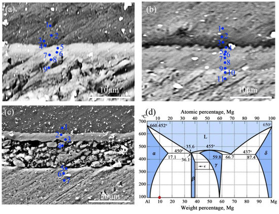 Figure 5a displays the positions of EDS points for the P1 samples. The chemical compositions highlighted in Figure 5a can be found in Table 2. Referring to the Al-Mg binary phase diagram (see Figure 5d) at a temperature of 350 °C, the maximum solution of Al in Mg was about ~5 at.%, and the maximum solid solution of Mg in Al was ~10 at.%. Moreover, Mg2Al3 (β-phase) and Mg17Al12 (γ-phase) can be formed at the interface. According to the stoichiometric proportion, it is inferred that position 1 and position 2 are the α-Mg and position 9 is the α-Al. Moreover, abundant LMCs are present between them. Adjacent to the Mg side (position 3–5), the microstructure might be the mixture of α-Mg and Mg17Al12 LMCs. However, next to the side of the Al (position 8), the mixture of α-Al and Mg2Al3 LMCs might be the dominant microstructure. The stoichiometric proportion at position 7 is closer to Mg2Al3 LMCs. It also infers that position 6 might contain a mixture of Mg17Al12 and Mg2Al3. Thus, for the P1 sample, the interface is mostly a multi-phase mixture, and there is no obvious single-phase LMC layer.