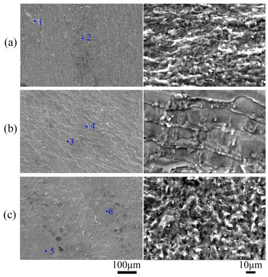 Figure 1 displays the SEM images capturing the interfaces of diverse Mg/Al composite sheets. This refers to the present hot-pressing technique with a thickness reduction of 40% at 350 °C, which can generate a good connection between 1060 and AZ31. According to reports [28,29], the bonding of the composite sheets relies on two crucial factors: the deformation temperature and the amount of strain. Diffusion is slower at low temperatures, thus affecting the quality of the metallurgical bond. When the strain amount falls below a critical value, the oxide layer present on the metal surface proves challenging to break, thus restricting the exposure of fresh metal. As a result, the composite plates are unable to generate strong metallurgical bonding. Liu et al. [10] discovered that the roll bonding threshold strain for the AZ31/1060 composite sheets is 20%. Thus, a thickness reduction of 40% at 350 °C can generate an effective metallurgical bond. Additionally, it has been observed that the strain rate exerts a significant impact on the characteristics of the interface. When subjected to hot pressing with strain rates varying from 1.0 × 10−3 s−1 to 1.0 × 10−2 s−1, a flawless interface layer forms, characterized by the absence of cracks and pores. After the strain rate is further reduced to 3.3 × 10−4 s−1, the interface layer undergoes fragmentation. Moreover, numerous white particles can be found on the entire cross-section. EDS analysis indicates that these particles may be rich in O, C, Si, Mn, etc. It indicates that some particles may be the polishing residues from SiC sandpapers.