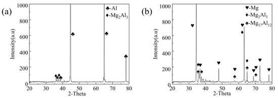 To validate the accuracy of the previously mentioned shear fracture position prediction, XRD analysis was conducted on the shear fracture of the P4 sample, as shown in Figure 7. The Al matrix side shear fracture surface (Figure 7a) exhibited the presence of the Al phase and Mg2Al3 phase. Similarly, the Mg matrix side shear fracture surface (Figure 7b) revealed the detection of the Mg phase, Mg2Al3 phase, and Mg17Al12 phase. These XRD results are in line with the findings from the EDS analysis, further confirming that the shear fracture position typically occurs at the Mg2Al3/Al interface and the Mg2Al3 layer. The fractured behavior at this position is greatly influenced by the interface structure and the properties of the diffusion layer formed at the Al/Mg interface during hot pressing. It is important to note that intermetallic compounds, such as Mg2Al3 and Mg17Al12, possess significantly higher Vickers hardness and lower plasticity compared to matrix materials. Additionally, studies have reported that the Vickers hardness of the Mg2Al3 phase is higher than Mg17Al12 [43]. Consequently, a brittle fracture is more likely to occur in the Mg2Al3 phase layer during shear. The thickness of intermetallic compounds also plays a crucial role in the fracture behavior and shear strength [44], where a thickness exceeding 10 μm results in reduced shear strength. The smooth cleavage plane observed on the shear fracture surface corresponds to the higher shear strength achieved, which explains the highest shear strength exhibited by the P3 sample.
