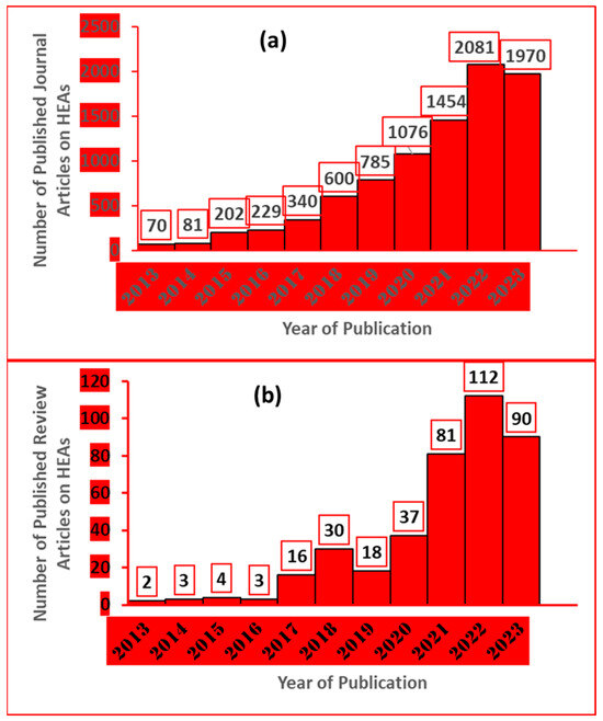 Number of Scopus-indexed publications on HEAs from 2013 to 20 October 2023: (a) All the Scopus-indexed publications excluding conference papers from 2013 to 2023; (b) Review articles from 2013–20 October 2023 (the data were obtained from the Scopus database on 20 October 2023 and plotted by the authors).