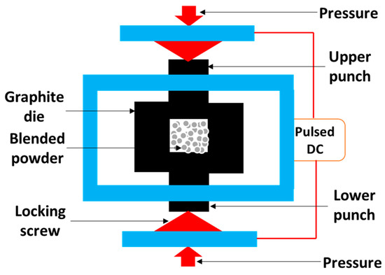 SPS is described as a non-conventional sintering technique employed in powder metallurgy which makes use of the pulsed direct current (DC) applied concurrently with axial pressure to consolidate a bulk mass of alloys, compounds, or composites. The bulk mass usually possesses an enhanced microstructure without pores, zero grain coarsening, inter-locked grain borderlines, cohesive matrix/additive interface, and uniformly dispersed reinforcements [21,22,23]. Figure 2 shows the fundamental operation of an SPS machine. It was reported that SPS achieves pure products by the action of the pulsed DC current which produces a very high temperature increase within the powder mass in such a way that all impurities are vaporized. The swift heating and cooling rates are responsible for the suppression of grain growth and unwanted intermetallic compounds. The simultaneous application of heat and di-axial pressure is responsible for the generation of highly densified bulk mass.