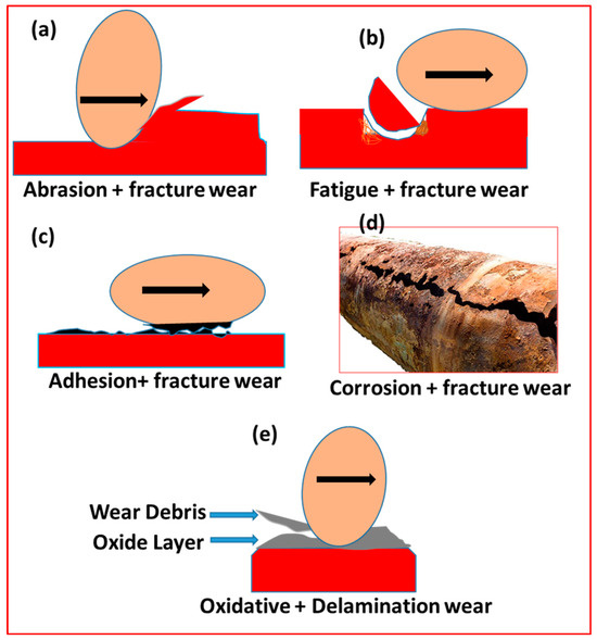 Schematic illustrations of various wear mechanisms. (a) Abrasive + fracture wear, (b) Fatigue + fracture wear, (c) Adhesion + fracture wear, (d) Corrosion + fracture wear, and (e) Oxidative + Delamination wear.
