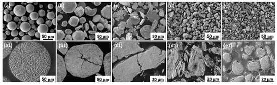 Morphological images of ball-milled CoCrFeMnNi HEA powder at different milling times: (a) as received; (b) 5 min; (c) 10 min; (d) 30 min; and (e) 60 min. (a1–e1) cross-sectional microstructures, adapted with permission from Elsevier [36].