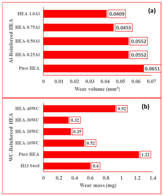 Plots of (a) wear volume of TiZrNbHf-Al HEA; Adapted from [56], permission with Elsevier, 2021; (b) wear mass of CoCrFeNi-WC HEA, Adapted from [57].