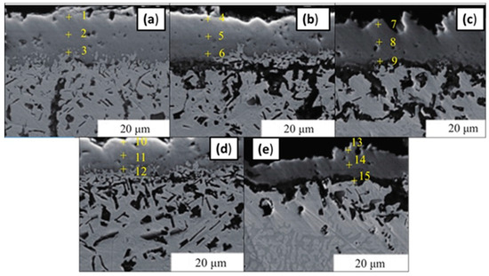 When oxygen atoms react with the atoms of the HEAs, especially at high temperature, they break and displace them from the surface. The principal dynamics that instigate oxidative wear include the presence of oxygen or oxidizing agents like O3, HNO3, H2O2, and Cl; high temperature; and moisture. Meanwhile, HEAs are premeditated to be corrosion-resistant; however, they can sometimes be vulnerable to oxidative wear. This is because HEAs usually contain a combination of dissimilar elements, some of which are susceptible to oxidation. Take, for instance, Cu, which is a regular element contained in HEAs, but which is very prone to oxidation. If it oxidizes, it creates pits and cracks on the material surface, which is a nucleation ground for fast-tracked wear [108]. Most often, oxidative wear ensues at elevated temperatures, at points where oxide layers develop on the periphery of the HEA, and then become detached by an opposing contacting body, whereas the newly formed exterior is oxidized again and again; thus, the reaction continues [104,109]. The oxidation reaction accelerates the wearing off of the material surfaces because the formed oxide films develop a weak configuration at high temperatures due to the elevated temperature tempering. The addition of some elements, like W, Hf, and Al, aids in suppressing oxidation at elevated temperatures in high-entropy alloys. In the research by Pole et al. [75], it was observed that, at a medium temperature of 423 K, the presence of W in TaTiVZrW aided the high-temperature oxidation resistance more than what Hf could contribute in TaTiVZrHf. However, at an elevated temperature of 723 K, the oxidation suppression of TaTiVZrW was weakened, and was heavily affected by high-temperature oxidation wear. But TaTiVZrHf HEA formed a mesomorphic eutectic lattice configuration which improved the oxidative wear resistance at that high temperature. In another study, Wu et al. [110] discovered that raising the volume fraction of Al in AlxCoCrCuFeNi HEA induced a high resistance to oxidative wear. There was an Al2O3 film that was generated when the bodies were rubbing against each other, and this aided in greasing the surface of the HEA and in reducing their asperity, COF, and wear rate. Jin et al. [111] worked on the COF of FeNiCoAlCu HEA. It was observed that the COF value in the temperature range of 20–400 °C was 0.9, but when increased to 600–800 °C, it reduced to 0.3. The X-ray photoelectron spectroscopy analysis disclosed that the generated oxide film was composed of Fe2O3, Fe3O4, Al2O3, and CuO, and that the repeated fracture and regeneration of oxide films contributed to the decrease in oxidative wear at the elevated temperature. To further demonstrate the function of Al in reducing the oxidative wear of HEAs, Ye et al. [70] discovered that an oxide film consists of three layers, as shown in Figure 7, when microstructural analysis was conducted on AlxCoCrFeMnNi HEA. In the absence of Al in the alloy, the oxidation wear was very severe. But, when Al was introduced, a dense aluminum oxide film evolved, and there was a decrease in the size of the oxide layer which implied that the aluminum enhanced the oxidation resistance. As the content of Al increased, the manganese fraction in the oxide film kept decreasing. For instance, in Figure 7e, at point 13, the aluminum fraction was 29.49 at%, while the manganese fraction was 27.08 at%; at point 15, the aluminum fraction increased to 33.42 at%, while the manganese fraction decreased to 4.76 at%. The explanation is that the evolved dense aluminum oxide at the instance of oxidation obstructed the penetration of manganese ions into the inner portion of the HEA; thus, this enhanced the overall oxidation suppression of the HEA.