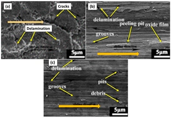 Abrasive wear or micro-shear wear manifests as the mini-cut off of the materials from contacting tribo-pairs as a result of relative motions amongst them and culminating into parallel grooves on the worn surfaces [122]. The principal theory of abrasive wear is Archard’s formular. It states that “the volume of material removed is proportional to the normal load, the distance of sliding, and inversely with the hardness of the materials” [123].