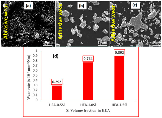 Yang et al. [92] developed FeCoCrNiMoSix HEA via SPS and characterized its wear behavior. The volume fractions of Si incorporated included 0.5, 1.0, and 1.5. The results obtained revealed that, when the percentage weight of Si increased, the wear mode transited from abrasive wear to the delamination (adhesive) wear mode, as shown in Figure 9, followed by grain coarsening. There was a higher percentage of delamination wear which stimulated the higher wear rate in FeCoCrNiMoSi1.0 and FeCoCrNiMoSi1.5 than in FeCoCrNiMoSi0.5. So, adhesive wear ploughs off more materials than abrasive wear. Even though the addition of the Si element improved the strength of the HEA, it equally raised the wear level (Figure 9d) and pull-off of materials from the surface of the alloy. It increased the roughness and grains of the surface (Figure 9b,c). The introduction of solid lubricants like graphite and molybdenum sulfide into HEAs can ameliorate adhesive wear.