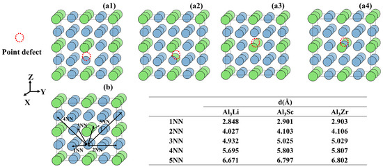 Before we discuss the optimal doping position of Er in off-stoichiometric Al3X, it is necessary to have a good understanding of the nature of point defects in Al3X. The point defects lead to small deviations in the stoichiometric ratios of the chemical compositions with respect to the fully ordered L12-Al3X, formatting the Al-rich and X-rich off-stoichiometric Al3X. For the 32-atom Al3X, there are four possible types of point defects, as shown in Figure 2(a1–a4), designated as VAl, XAl, VX, and AlX, respectively. Considering the large number of free Al atoms from the aluminum matrix filling around the Al3X crystals, the different types of point defects formed were discussed. For Al-rich off-stoichiometric Al3X, the X atom in Al3X migrates and leaves VX. The vacancy would be occupied by the Al atom from inside the Al3X or Al matrix, forming AlX. For X-rich off-stoichiometric Al3X, the Al atom migrates and reforms the vacancy of VAl; the X atom from Al3X could occupy the vacancy to form an antisite XAl. The atoms were allowed to occupy their ideal lattice positions in the off-stoichiometric Al3X supercell at the beginning, and then local relaxation of atoms around the point defect was performed in order to enable all atoms to move to their equilibrium positions. To better understand the lattice structure, the mean distance of n-th nearest neighbors (nNN) of atomic pairs in Al3X were counted and shown in Figure 2b. The point defects caused the displacement of atoms, and the specific data is shown in Table S3.
