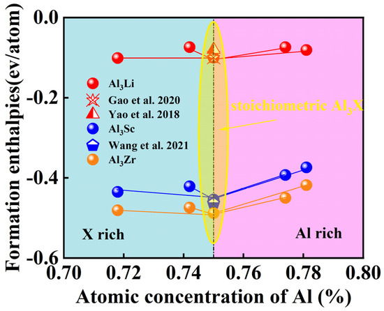 In general, the lower the alloy formation enthalpy of defective Al-rich or X-rich off-stoichiometric Al3X supercells are, the better their stability would be [49,85]. Fully relaxed formation enthalpies of ordered stoichiometric Al3X, Al-rich, and X-rich off-stoichiometric Al3X were listed in Table 2 and Figure 3. It can be seen that the formation enthalpies of defective off-stoichiometric Al3X supercell alloys were negative, indicating their thermodynamic stability [86]. The results of Al3Li, Al3Sc, and Al3Zr in Table 2 were also consistent with previous theoretical calculations [16,62,86,87]. For X-rich off-stoichiometric Al3X alloys, the formation enthalpies of Al antisite (XAl) (Al3Li—0.101 eV/atom, Al3Sc—0.435 eV/atom, and Al3Zr—0.481 eV/atom) are smaller than that of Al vacancy, meaning that Al antisite defect (XAl) are stable. In addition, the results showed that the stable point defects in L12 Al3X are antisite on both Al-rich and X-rich off-stoichiometry. For off-stoichiometric Al3Sc and Al3Zr, the results showed that the stable point defects are Al antisites in X-rich and X vacancies in X-rich off-stoichiometry.