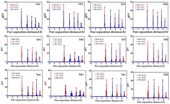 The point defect changed the distance of the surrounding atoms. To quantify and distinguish the structural properties of the defective off-stoichiometric Al3X, we calculated radial distribution functions (RDFs) of the Al-Al, X-X, and Al-X atomic pairs within these defective structures and took a comparison. The results are shown in Figure 4(1a–3d). The RDF as a key quantity for evaluating the local distribution of atomic pairs can be expressed as [88]: