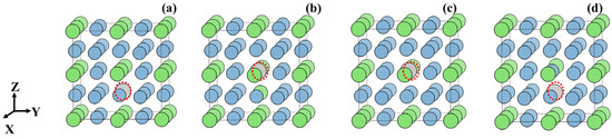 The site preference of Er in off-stoichiometric Al3X was calculated by taking four occupation sites in off-stoichiometric Al3X: (i) the Er atom directly occupying the Al site (ErAl); (ii) the Er atom replacing the Al site meanwhile the Al atom occupying X site (ErAl + AlX); (iii) the Er directly taking up the X site (ErX); and (iv) the Er replacing the X site meanwhile X atom occupying the Al site (ErX + XAl). The four occupation positions of Er occupying 32-atom Al3X are shown in Figure 5a–d.