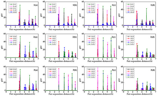The radial distribution functions (RDFs) for the Al-Al, X-X, Al-X, Er-Al, and Er-Li atomic pairs in defective off-stoichiometric Al3X with (1a–3a) ErAl, (1b–3b) ErX + XAl, (1c–3c) ErX, and (1d–3d) ErAl + AlX.