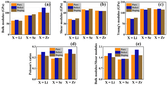 (a) Bulk modulus B; (b) Shear modulus G; (c) Young’s modulus E; (d) Poisson’s ratios; and (e) Ratios of the bulk modulus to shear modulus (B/G) of pure, defected, and Er-doped L12-Al3X phases.