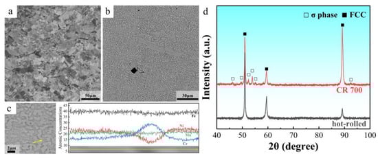 Scanning electron micrographs (SEMs) of hot-rolled and CR700 samples are shown in Figure 1a,b. For hot-rolled samples, a completely equiaxed crystal structure was observed. As for the CR700, it showed a typical partially recrystallized microstructure with small second-phase particles and few oxides. The SEM–EDS line-scan results show that the second-phase particles are rich in Cr and poor in Ni (Figure 1c). Then, the XRD results show that the hot-rolled sample is a single-phase FCC structure and the CR700 sample consists of an FCC phase and a σ phase (Figure 1d). Combining the above results and previous studies [,], the particles in the cold-rolled sample are Cr-rich tetragonal σ phase. Partially recrystallized microstructure and dispersed particles combined to form the heterogeneous structure, which gives the CR700 well-balanced tensile mechanical properties at room temperature [].
