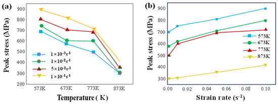 The peak flow stress is plotted as a function of the deformation temperature and strain rate, as shown in Figure 3. It can be found from Figure 3a that under the same strain rate, the higher the deformation temperature, the lower the peak flow stress. Due to the increase in the deformation temperature, the thermal motion of the atoms inside the material intensifies, the kinetic energy increases, and the bonding force between the atoms weakens, resulting in the reduction in the critical shear stress of the alloys and the shear resistance. More slip systems appear during the plastic process. In addition, the increase in the deformation temperature accelerates the migration speed of dislocations, which makes the cross-slip of screw dislocations and the climbing of edge dislocations in the alloy easier, resulting in the enhancement of the softening effect during plastic deformation. Moreover, the different behavior at 773 K is observed in Figure 3b, which is related to the changes in the hardening–softening mechanism [] and will be further investigated in our subsequent work.