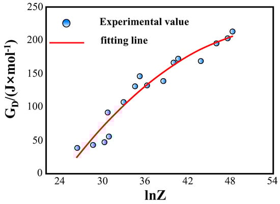 where V is the molar volume, and ignoring the effect of the temperature, V is 7.1 × 10−6m3·mol−1. For FCC metals and alloys, M is taken as 3.11, while the shear modulus is 79 GPa, and k is taken as 0.15. Bring the peak stress into Equation (18), and then we can fit the relationship between the Z parameter and the deformation energy storage, as presented in Figure 5.