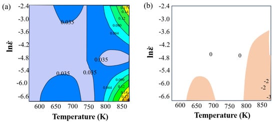 The hot working map is useful to analyze the microstructure evolution during high-temperature deformation of metallic materials from the perspective of energy conversion. The material hot working map, established based on the dynamic material model, is widely used to study the hot deformation behavior of materials []. By calculating the deformation conditions that may cause instability of the materials, the instability region can be avoided and the machinability of the materials can be predicted.