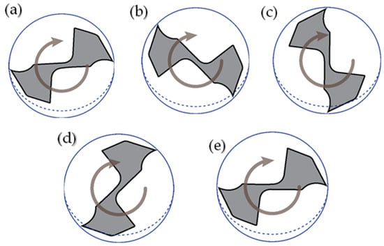 (a) Cutter at 0° rotation angle; (b) cutter at 45° rotation angle; (c) cutter at 90° rotation angle; (d) cutter at 135° rotation angle; (e) cutter at 180° rotation angle.