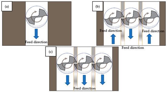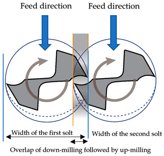 The milling process was divided into three distinct phases of experimental trials, as depicted in Figure 5. The initial phase involved machining single milling slots (Figure 5a), where various combinations of cutting parameters were explored. Subsequently, the second phase employed duplicate milling strategies, which included both up-milling paired with up-milling and down-milling paired with down-milling configurations (refer to Figure 5b). The third and final set of trials was specifically designed to assess the efficacy of hybrid milling strategies. This phase encompassed configurations of up-milling paired with down-milling and down-milling paired with up-milling (see Figure 5c). A comprehensive overview of all the variables pertinent to the milling tests is presented in Table 3.