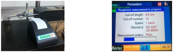 Figure 3 illustrates the test rig configuration employed for machining the workpieces, showcasing the key components and arrangements. To quantify the surface roughness grade, the Tesa-Rougossurf-90G instrument, produced by Tesa-Bugnon in Renens, Switzerland, was employed, as depicted in Figure 4. The arithmetic average of surface roughness (Ra) has been selected for evaluating surface texture because it is the industry standard for gauging the quality of a surface. For the characterization of surface roughness, a cutoff length of 0.8 mm, a cutoff number of 19, a measuring speed of 1 mm/second, and a plain measurement surface type were utilized. At least three measurements were taken for each set of cutting conditions, and the average values were then calculated.