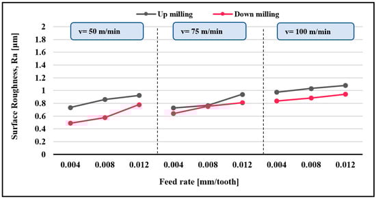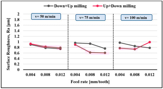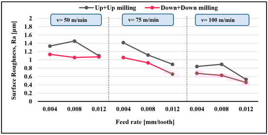 Figure 6 illustrates the measured surface roughness outcomes from the single-mode experiments employing both up- and down-milling strategies. This graphical representation offers a comparison between the two milling strategies concerning the resulting surface roughness. Moreover, the impacts of feed rate and cutting speed on the measured surface roughness are displayed for both milling strategies. The results reveal that the up-milling strategy consistently yielded higher surface roughness values across all trial scenarios than those obtained through down-milling. This discrepancy in surface roughness outcomes between the two strategies was particularly pronounced at the lowest cutting speed (v = 50 m/min) and became relatively less pronounced as the cutting speed increased (v = 75 and 100 m/min). Specifically, an increase of approximately 22% in surface roughness was observed in the up-milling strategy compared to the down-milling strategy.